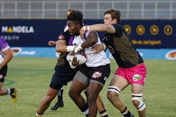 Caption: FNB Madibaz flank Brandon Brown tackles Akhona Nela of NWU-Pukke during their Varsity Cup rugby match at Madibaz Stadium in Port Elizabeth last week. Photo: Asem Engage