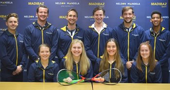 Caption: The Madibaz squash team to compete in the University Sport South Africa tournament in Cape Town from June 30 to July 5 is (back, from the left) Murray Schepers, Johan Thiel, Jason le Roux (coach), Liam Ford (manager), Warren Bower, Gershwin Forbes, (front, from the left) Bianca Brown, Hayley Ward, Micaela Boy and Dani Shone. Photo: Brittany Blaauw